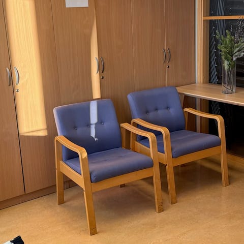 4 røde stoler. Må hentes asap på Lindern. Gode å sitte i. Har blitt brukt både på møterom og til spisestue