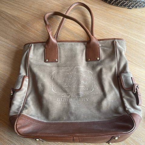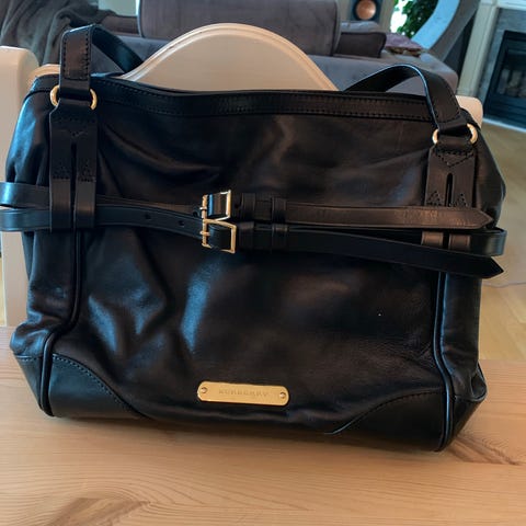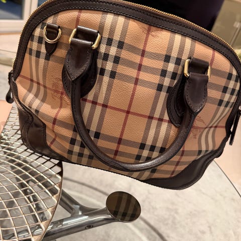 Burberry lær dame veske med klassisk rutemønster og brun skinn detaljer. Vesken har justerbare skulderstropper men det manler knapp lukking. Der for selger jeg billig!! Egnet for daglig bruk og oppbevaring av personlige eiendeler. Den er i god stand pen brukt, selger for 1500kr.