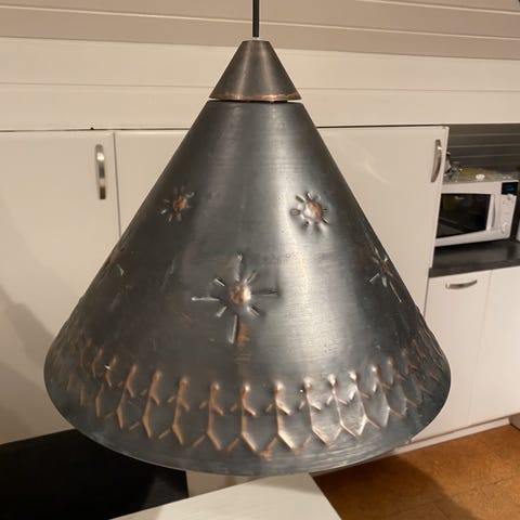 Utrolig tøff taklampe fra 70-tallet. Kobber med glassdetaljer. Gir et veldig behagelig og dekorativt lysbilde.