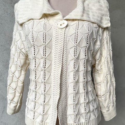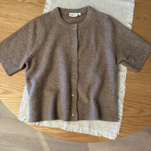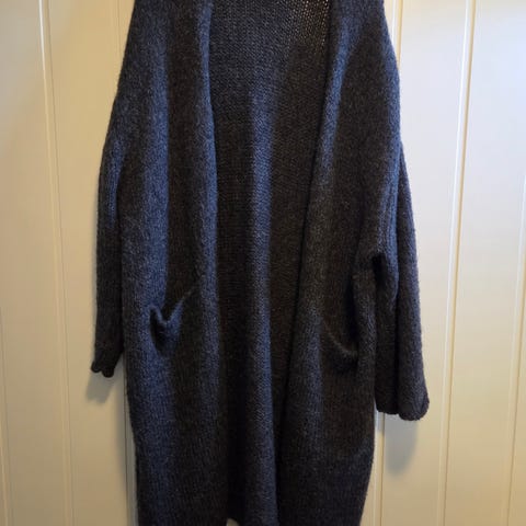 Cardigan med omslagssnitt i myk, skinnende fløyel med knytebelte i midjen. Modellen har vide ermer og en rett, avslappet passform. Faller over hoften.