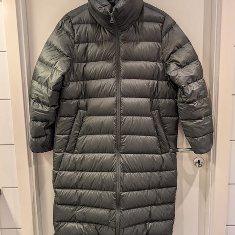 Deilig og varm dunkåpe fra Lindex, str S. God hette og herlige lommer å stappe kalde hender nedi.