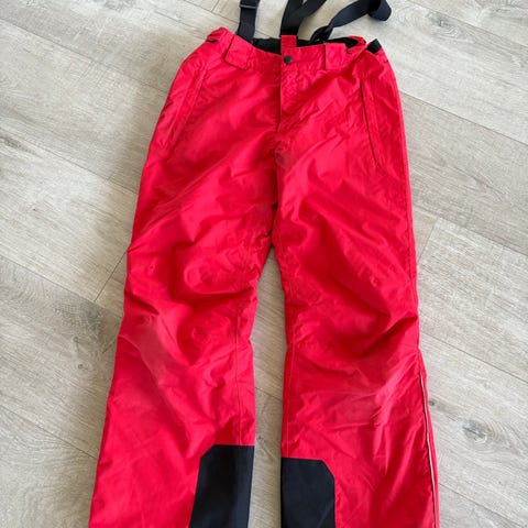 Vinterbukse/skibukse i størrelse 152, laget av polyester. Buksa har justerbare seler og forsterkninger på innsiden av bena for ekstra slitestyrke. Designet for barn og egnet for vinteraktiviteter. Ingen skader.