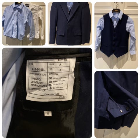 Pascal pendress til gutt i str 7 år, i marineblå med fargekode blue 24023L. Følger med Vannucci blå strykefri skjorte i samme størrelsen, som er helt nydelig, både til dressen og ellers.