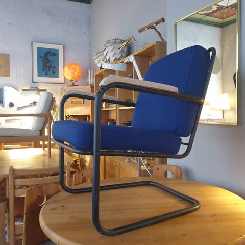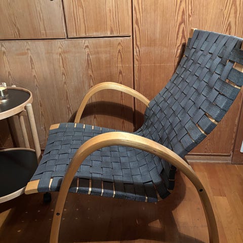 Matrialet til stolen er laminert bjørk og nylonbånd. Mål ca: Høyde 90cm, bredde 60cm og dybde 80cm.