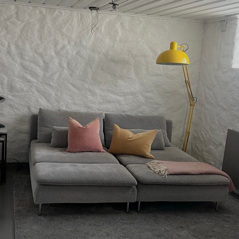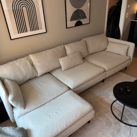 Fireseters Söderhamn-sofa selges. Sofaen har kloremerker etter katt og er derfor noe slitt, særlig ved armlenene. Det er imidlertid mulig å kjøpe nye trekk, og alle trekk er avtagbare og vaskbare. Fargen heter Isundagrå.