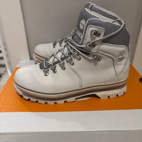 Timberland Euro Hiker tursko til dame i str 38. Gode vanntette tursko i skinn, litt merker etter å ha gått i skog og mark, men de er minimalt brukt. De er noen år gamle, men ser veldig gamle ut pga modellen. Passer ikke foten lenger etter graviditet.