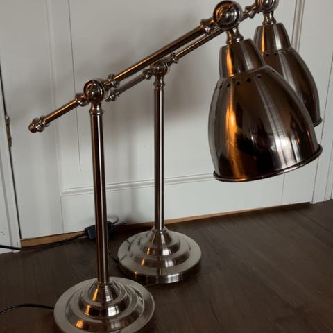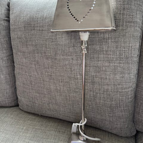 Kjøpt for et par år siden. Bare stått på sminkebordet, har ikke hengt den opp på veggen. Følger ikke med skruer eller noe til å henge den opp med. Pærer kan følge med, kjøpte en pære for lite så har bare brukt en vanlig, gjennomsiktig på siste hull.