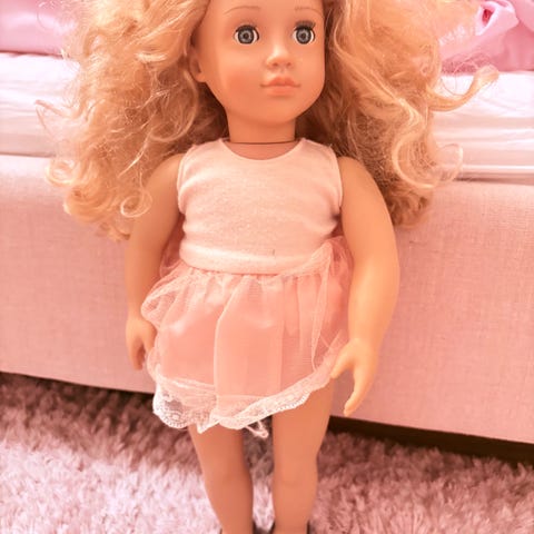 dukke med klær i blomsterprint og bæreveske med rosa detaljer. Dukken har tilbehør som smokk og hodeplagg og kan ta totten.