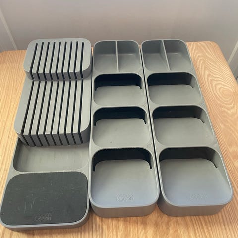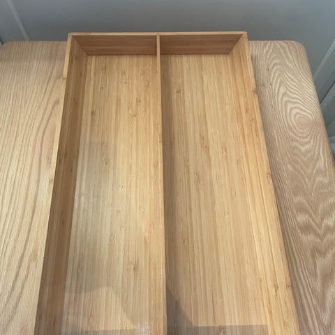 IKEA Bestickinnsats i tre, designet for organisering av bestikk og kjøkkenredskaper. Har flere rom i ulike størrelser for effektiv oppbevaring. Passer til 60 cm skuff. Målene er 51 x49 x 6 cm.