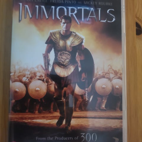 DVD-utgave av filmen Immortals med Henry Cavill, Freida Pinto og Mickey Rourke. Film i standard DVD-format.