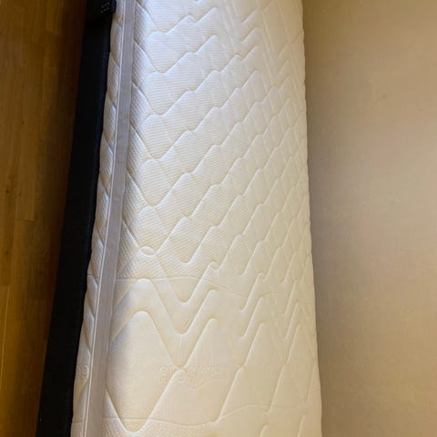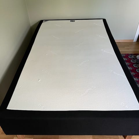 Den er 10-15 år gammel, man har vært lite brukt. Madrassen har noen flekker på ene siden. Kan kanskje fjernes med flekkrenser. Det følger med fjernkontroll for styring av posisjon på rygg og ben.