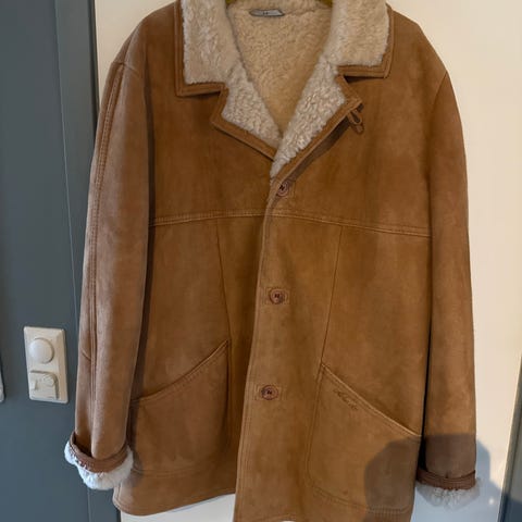 Aleksander of Norway Annet yttertøy i skinn, brun farge, størrelse 38 for dame. Plagget har en lang modell med knappelukking og foret med lyst, mykt materiale. Egnet som yttertøy ved kaldt vær.