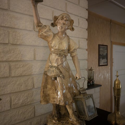 Unik vintage bronse veggdekorasjon – gresk obereg med figur og fugler