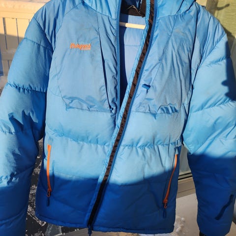 Fantastisk digg lett varm dunjakke fra Bergans modell Memurutind i str S. Super fin blåfarge med orange detaljer.