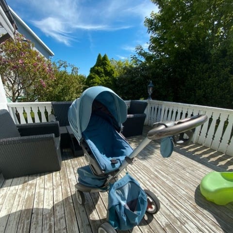 Stokke barnevogn med grå sete og brun skinnhåndtak