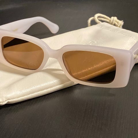 Selger et par veldig kule solbriller fra merket The Shade, modell "Superior". Solbrillene har en moderne retro-look med en kraftig innfatning i en lekker kremhvit/off-white farge som passer til alt.