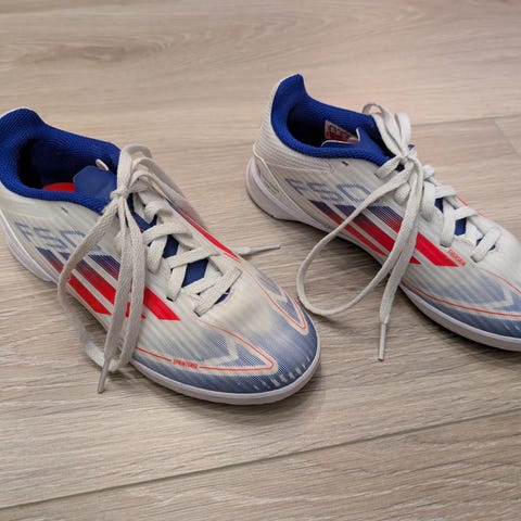 Adidas F50 innefotballsko i lilla og grønne farger. Skoene er størrelse 29. De har snøring og en flat såle tilpasset innefotball.