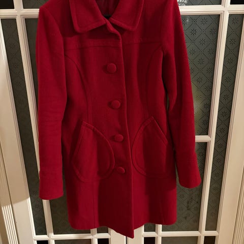 Nesten ubrukt kåpe i mørke rød/burgunder farge i størrelse M selges veldig rimelig. Kåpen er veldig elegant og kan også brukes til spesielle anledninger i tillegg til hverdags bruk.