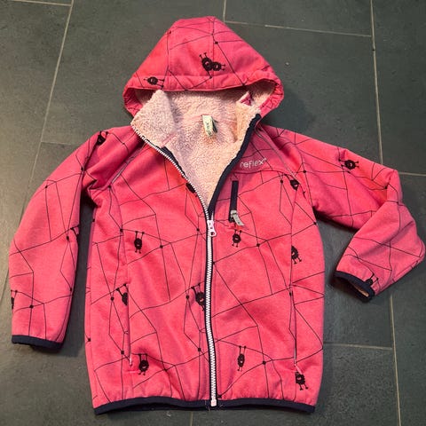 Reflex jakke i størrelse 122 for jenter. Jakken er rosa og laget av polyester. Den har hette og lukkes med glidelås. Egnet som ytterplagg for barn.