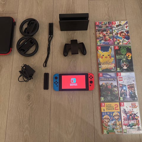 Nintendo Switch med spill og tilbehør