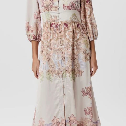 Neo Noir kjole i blå satin, størrelse M for kvinner. Kjolen har et mønster og langermet design med knapper og belte i midjen. Materialet er glatt og lett, egnet for formelle og uformelle anledninger.
