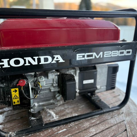 Honda EX1000 bensin generator med effekt på 1 kW. Rød farge, utstyrt med to AC-utganger. Egnet for bruk som bærbar strømkilde ved frakoblet strøm eller utendørsaktiviteter. God stand.