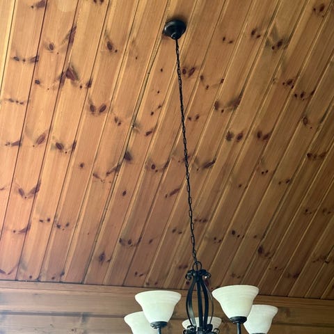 Taklampe med metallramme og glasskupler. En spot som lyser ned. Designet med flere armer som holder glasskupler for små lys.
