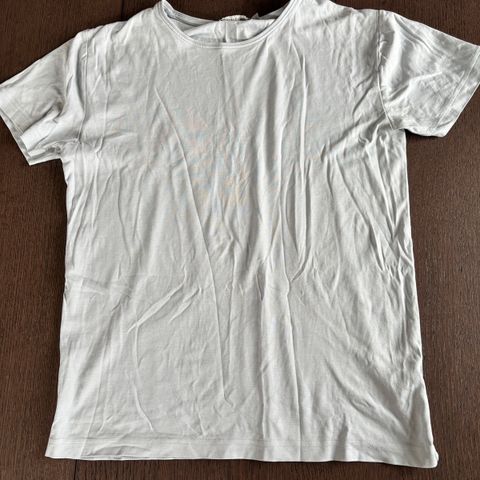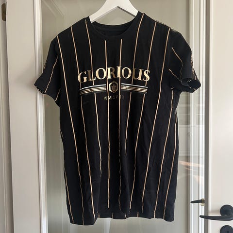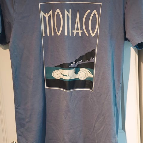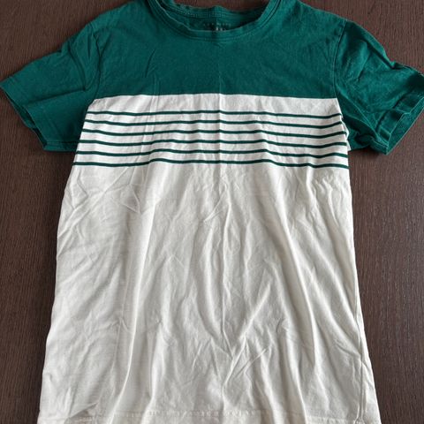 T-skjorten er pent brukt og er i fargen marineblå med røde og hvite striper. 85 prosent bomull og 15 prosent akryl