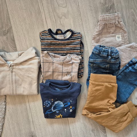 Alt er i str 80 (mørkeblå og brunt sett er str 86, men er små i str, tilsvarer str 80)
