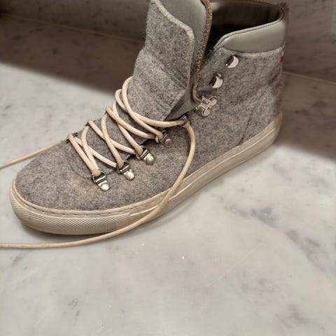 Diemme Sneakers joggesko i størrelse 36. Fargen er grå, og materialet ser ut til å være filt eller ullstoff. Skoene har hvite lisser og hvit gummisåle. Laget i Italia. Nesten ikke brukt