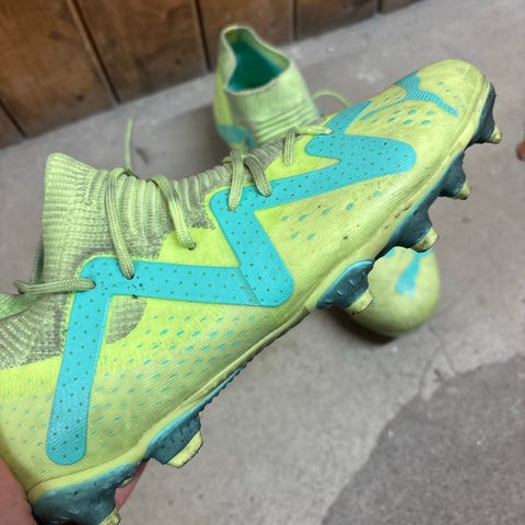 Puma fotballsko til barn / junior i strl. 38 beregnet til gress og kunstgress. De er lite brukt, men har fått noe misfarging som kan sees av bildet. Det er også en autograf på den ene skoen som jeg ikke husker hvem har signert