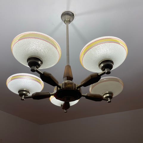 Nydelig, eldre lysekrone med 5 armer som gir et klassisk og elegant uttrykk. Perfekt som statement-lampe i stue, spisestue eller soverom.