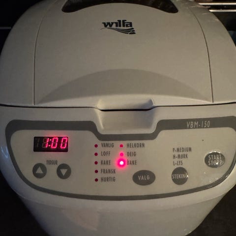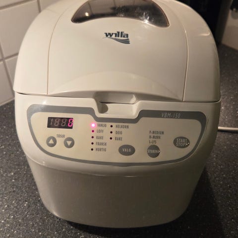 Wilfa Classic brødbakemaskin i hvit farge. Maskinen har digitalt display og flere funksjoner for baking, inkludert timer og ulike bakeprogrammer. Innebygd beholder for deig og kniv for elting. Passer til hjemmebaking av brød. Helt fin og lite brukt, digitalt oppskrifte hefte og bruk av maskinen følger med.
