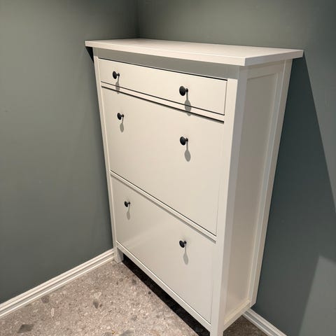 Ikke noe mer å tilføye enn det IKEA beskriver. Må hentes. https://www.ikea.com/no/no/p/hemnes-skoskap-med-2-rom-hvit-20169559/