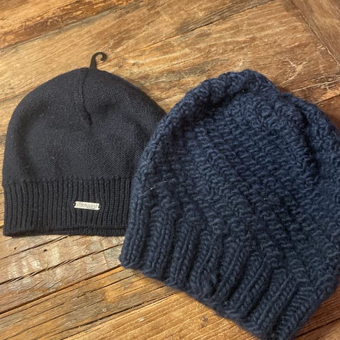 To gode luer. Blå lue i ullblanding fra Cubus, den brune i ull fôret med sort fleece. Pris pr stk