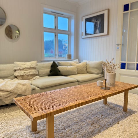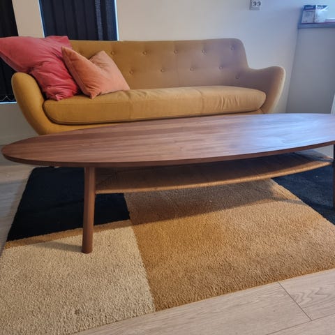 Nydelig, romslig og praktisk stuebord fra IKEA. Bordet er brukt med noen små merker, men ser generelt veldig pent ut og har masse bruk igjen. Selger det billig pga. merkene. Tauhyllen under bordet er strøken.