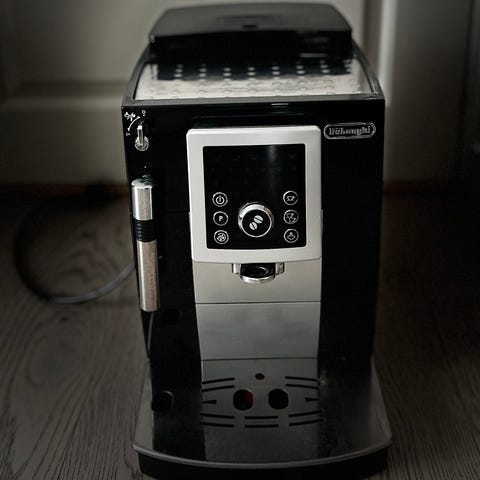 Two broken coffee machines, selling for parts. 400 for both. DeLonghi Magnifica S espressomaskin med svart farge. Maskinen har flere kontrollknapper og en dreiebryter for justering av innstillinger. Den inkluderer en steamstav for melkeskumming og et dryppbrett under kaffetuten.