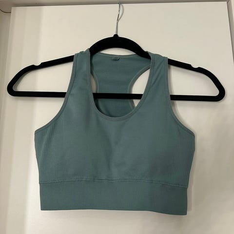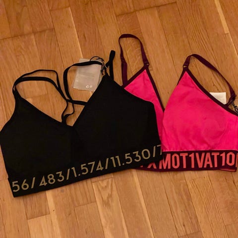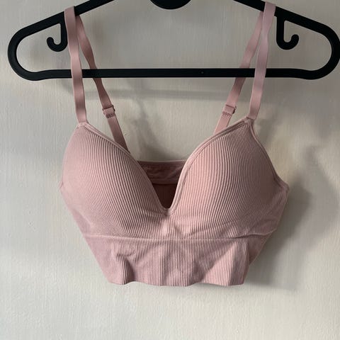 Trenings-BH for dame i størrelse S, laget av 80% nylon og 20% spandex. Egnet for fitness og trening, designet for komfort og støtte under fysisk aktivitet. Fargen er hvit. Peach ballerina topp.