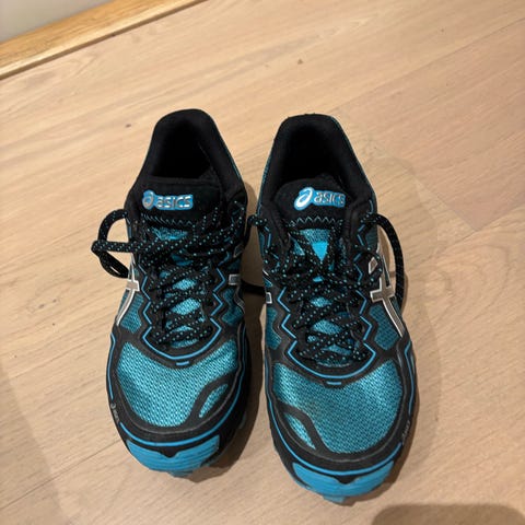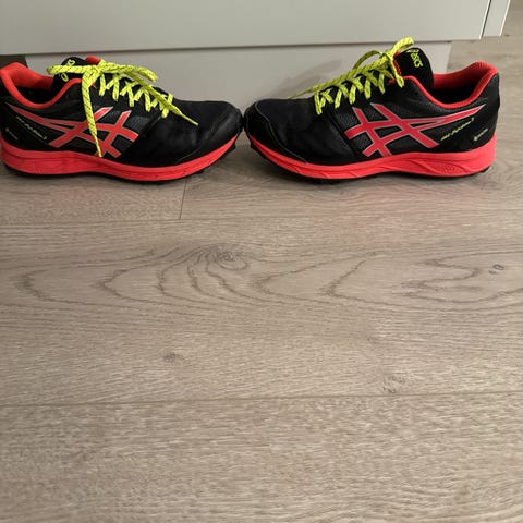 Asics Gel-Fujisetsu 2 løpesko i størrelse 44,5 Skoene har svart og oransje farge, og er designet for løping på is.