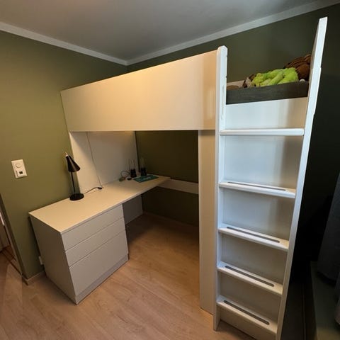 Sengen har integrert skrivebord og 3 romslige skuffer og klesskap.