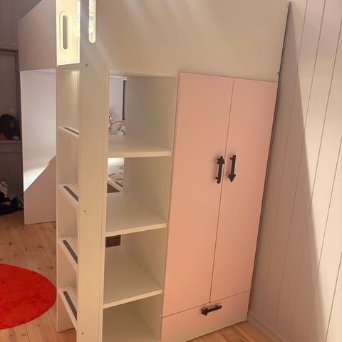 Selger en Småstad loftseng 90x200 cm i hvit med blekrosa detaljer.