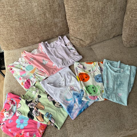 Diverse pene jenteklær i str 110/116,og noen få plagg 104 men de er romslige på størrelse. Pent brukt uten hull eller store flekker