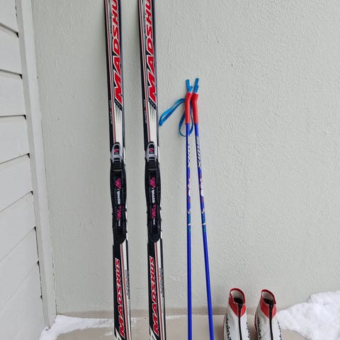 Madshus felleski 107cm, Swix staver 85cm og Alpina skisko str 30 . Reservert.