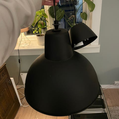 Selger en pen taklampe med tre lyspærer, pærene kan dimmes om du kobler til en dimmebryter.