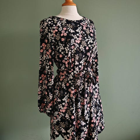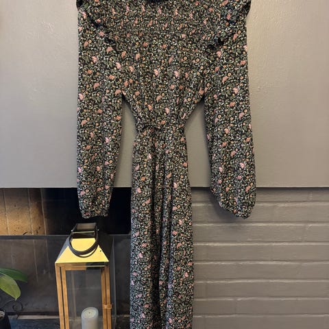 Kjolen er meget pent brukt. Str. S. Brystmål fra armhule til armhule er 49 cm, og hel lengde fra skulder og ned er 89 cm. 100% polyester.
