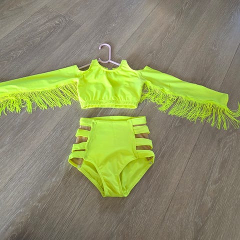 Skjørt og drakt kjøpt på proffesjonell dansebutikk i Oslo , men ble kjempefort for lite. str 134 kan få emd to sorte strømpebukser på kjøpet