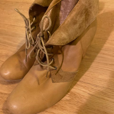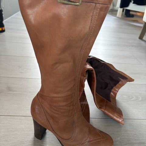 Bianco støvler i størrelse 40, laget av brunt skinn. Støvlene har en spiss tupp og en middels høy hæl. Tuppen har noe slitasje men ellers i meget godt skikk