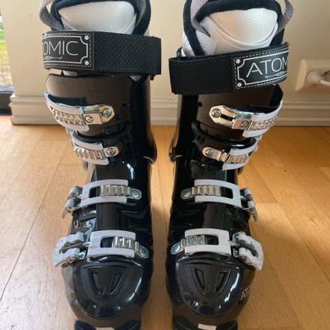 alpinstøvel 260-265. Støvlene har fire spenner for god justering og en solid såle med godt grep. Farge svart med grønne detaljer. Egnet for alpinski.