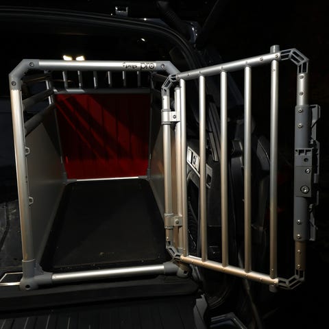 Hundebur i metall med regulerbar lengde, nødåpning bak og låsbar dør. Buret er cirka 55 cm høyt og 52 cm bredt. Passer i Tesla X,Y og S. Passer for setter-str. nesten ikke brukt. Crash testet. Kjøpt nytt for ca 7000,-