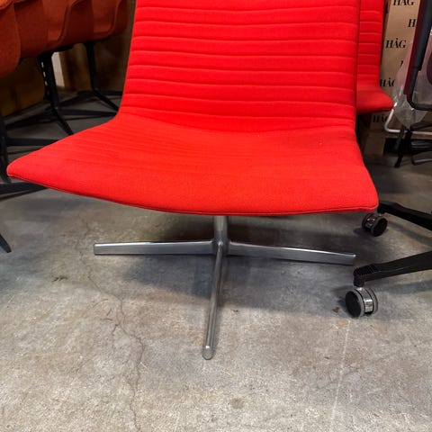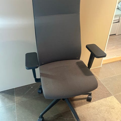 Stolen har hvitt skall, hjulkryss og beige melert tekstil. Moderne design, komfortabel og egner seg godt til kontor, møterom eller hjemmekontor. Pent brukt og i god stand.
